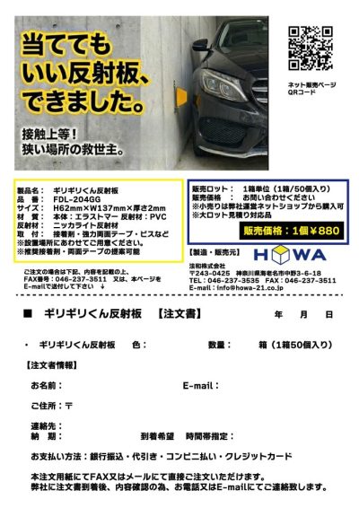 インフォメーション 新製品 2026.01.05 ■ ギリギリくん反射板 ぶつけても良い反射板出来ました カタログ・注文用紙 2026年!新発想 ぶつけても良い反射板 狭い場所の安全対策に大活躍! 「ギリギリくん反射板」 ・当てても壊れない ・厚み2mm ペラペラ反射板 ・反射材は日本製の高品質品 カタログ・サンプルをご要望の方は法和株式会社までご連絡下さい。 E-mail:info@howa-21.co.jp 件名:ギリギリくん反射板サンプル依頼 ※画像をクリックすると販売ページへジャンプします! 駐車場安全対策反射板