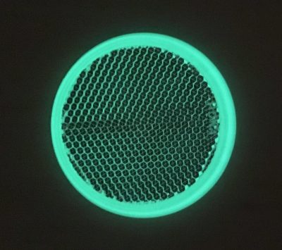 本製品は光を蓄えて暗くなると緑色に発行する蓄光機能とライトが当たると反射して光る再帰反射機能のW機能を搭載した蓄光プリズムレンズ反射リフレクターとなります。